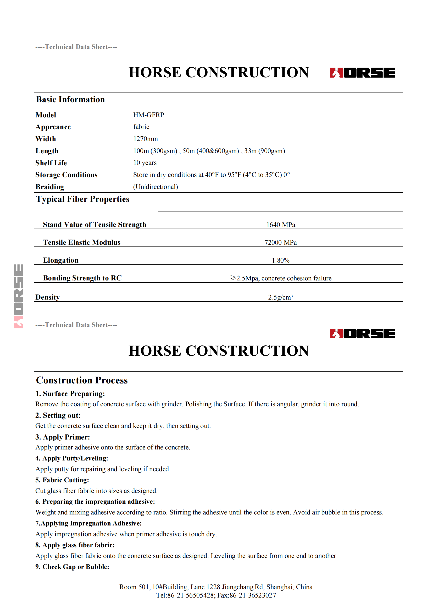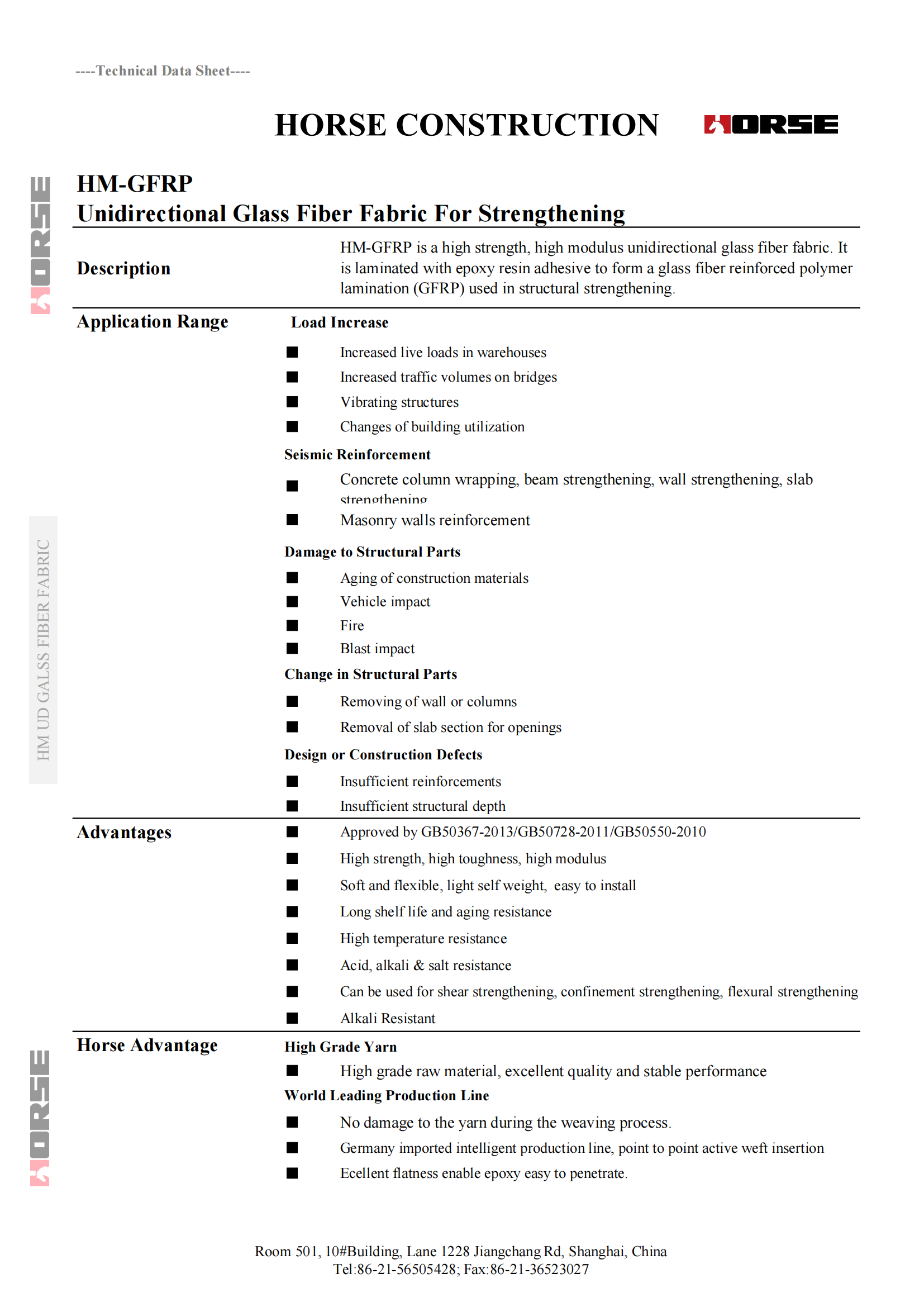 HM-GFRP is a high strength, high modulus unidirectional glass fiber fabric. It  is laminated with epoxy resin adhesive to form a glass fiber reinforced polymer  lamination (GFRP) used in structural strengthening.